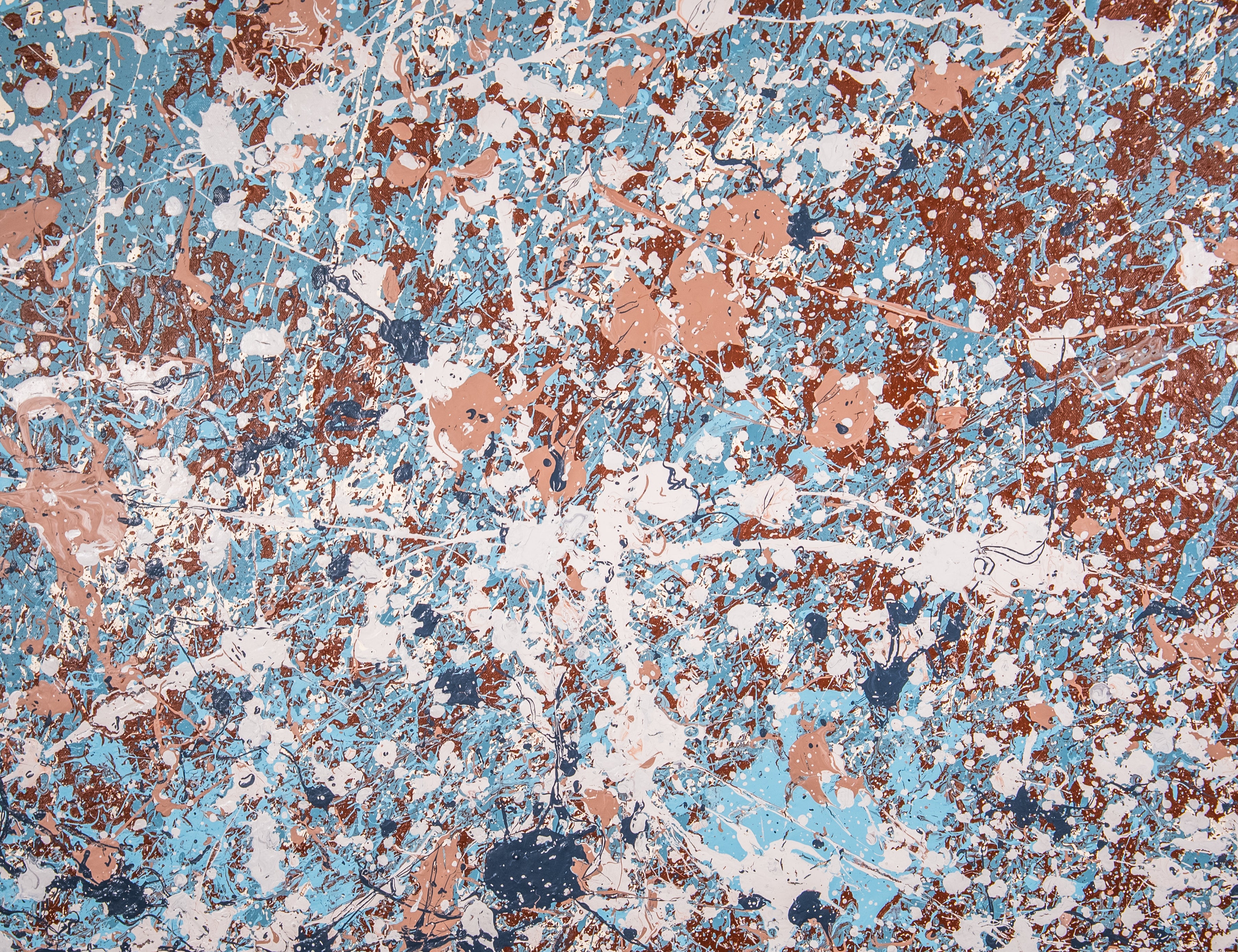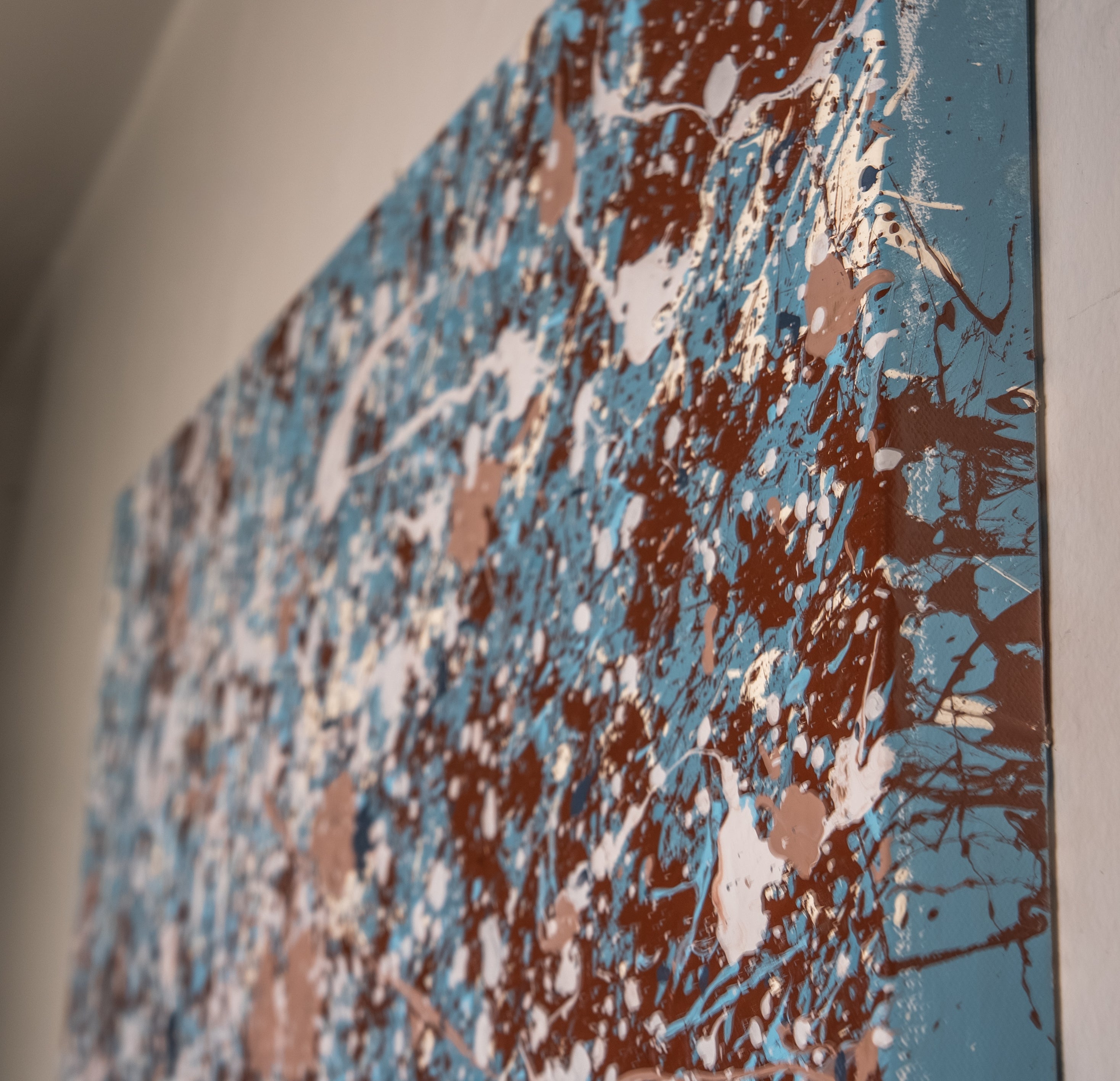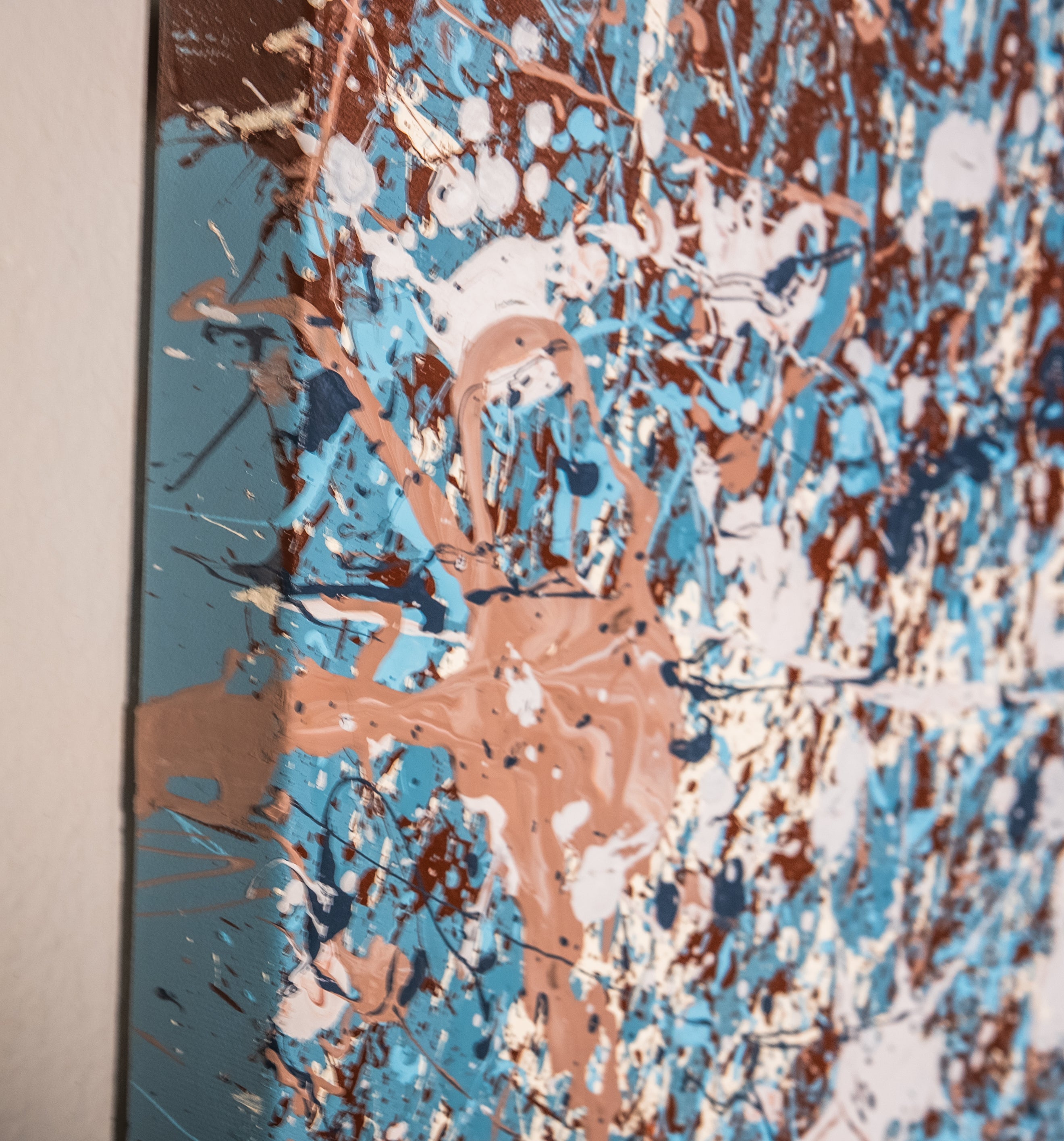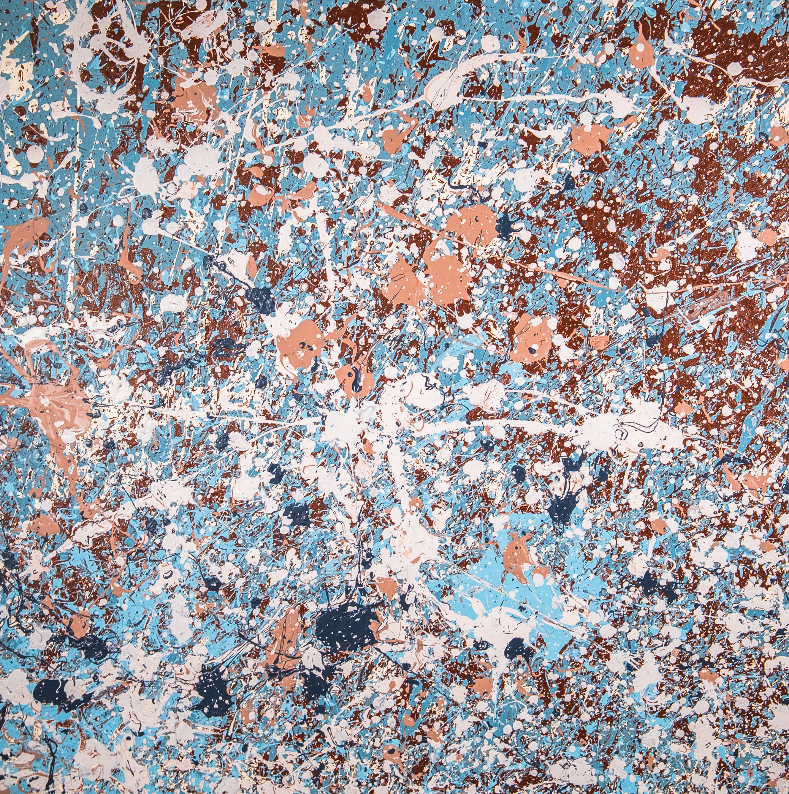 For this project, our team was suspended from a crane that lifted from 6-75ft off the ground. (9) 36" x 36" canvas were arranged below, and meticulously splattered from various Heights, creating elegant patterns of overlapping paint. This act was performed to see how we could push ourselves as artists - with the intent of spreading peace. This specific color palette is soothing, freeing, and inspires hope. These pieces look elegant on the wall in any home or business looking to bring their indoor environment to life. Upon the completion of these works, our crane operator compared these to the works of Diego Rivera & Picasso.