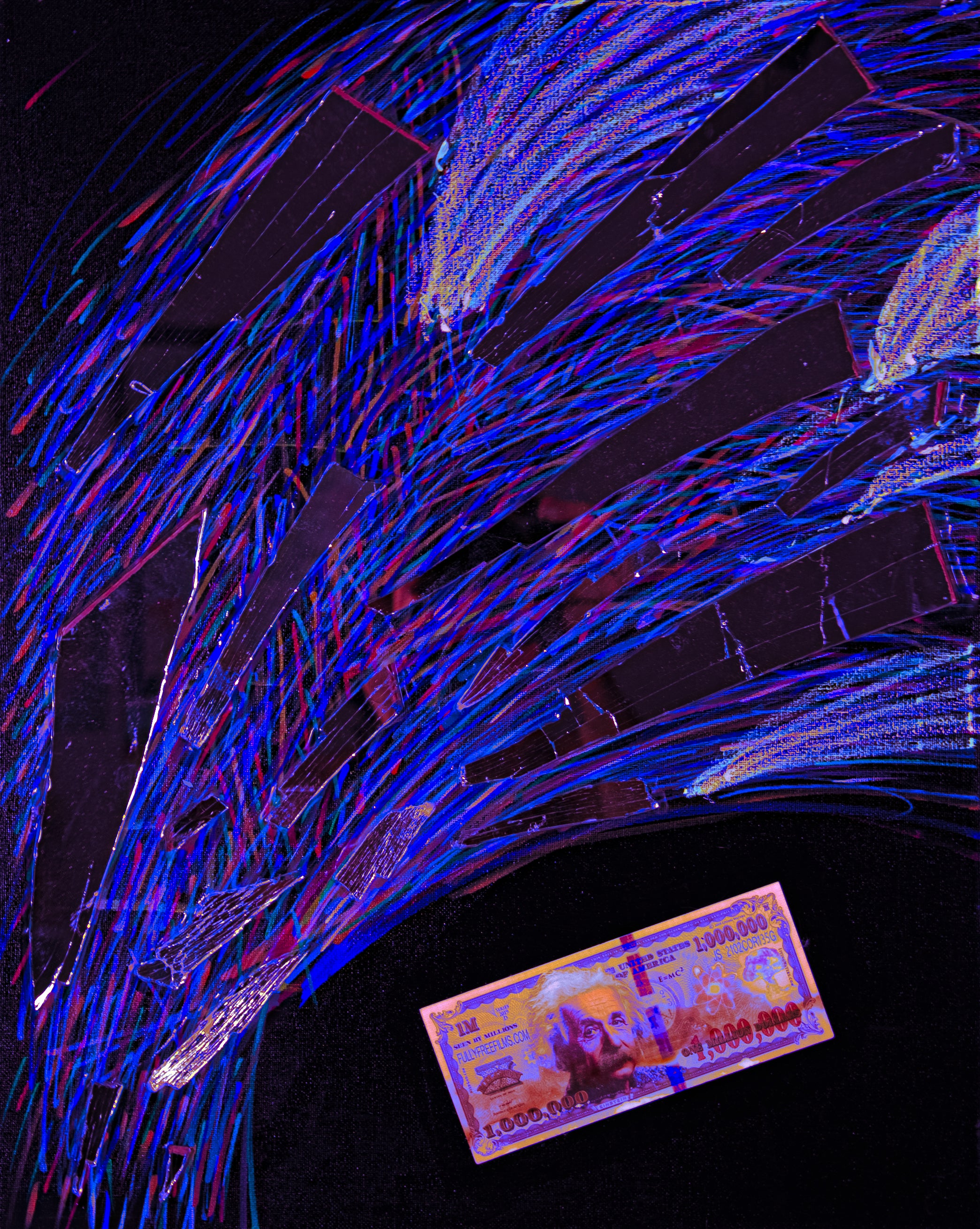 The cornerstone of the collection, ‘We Want World Peace’ fuses numismatics and street vernacular into a civilizational thesis. The embedded $2 bills act as both artifact and argument, while the gestural field insists that aesthetics can underwrite ethics. This is not a poster; it is policy in pigment.