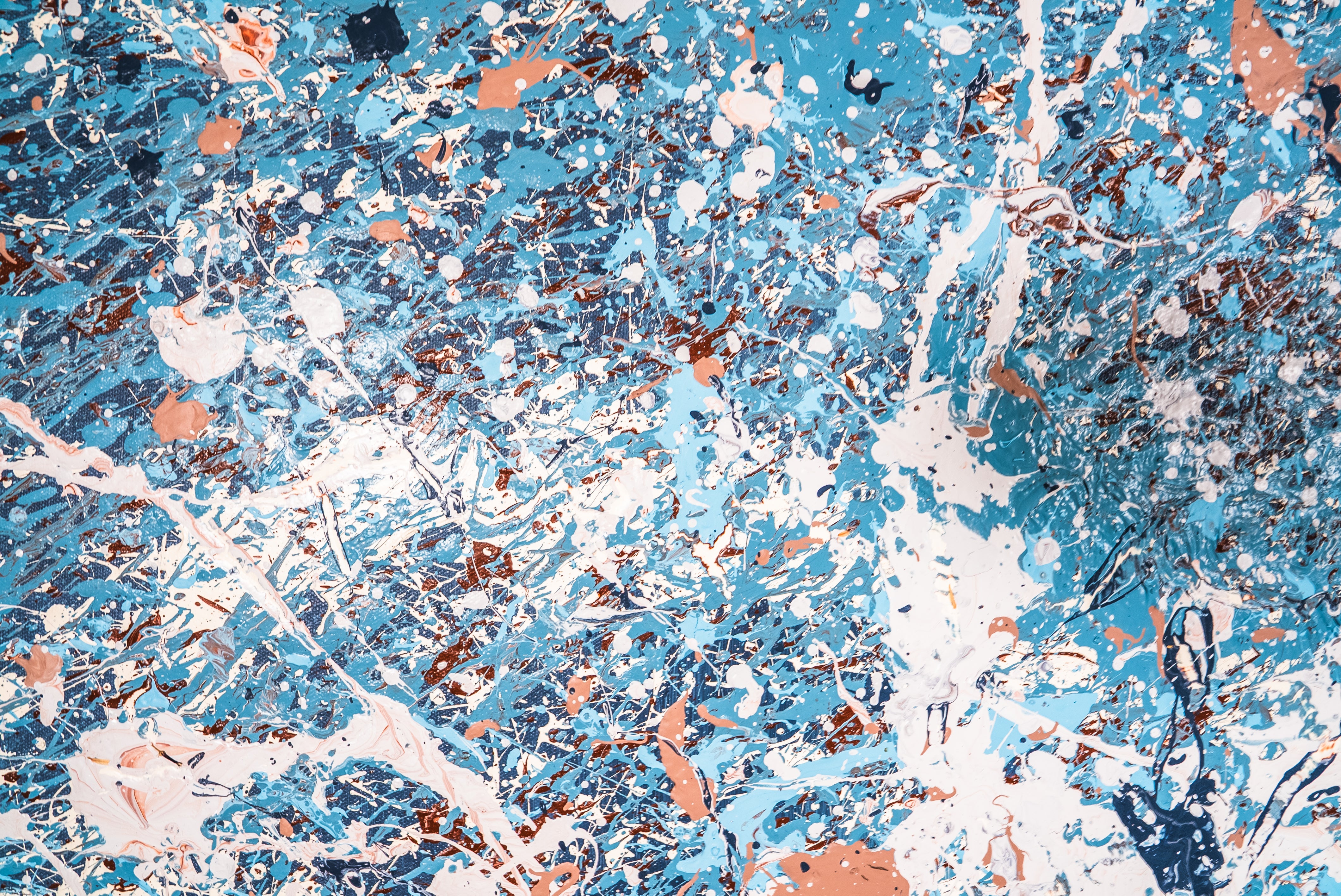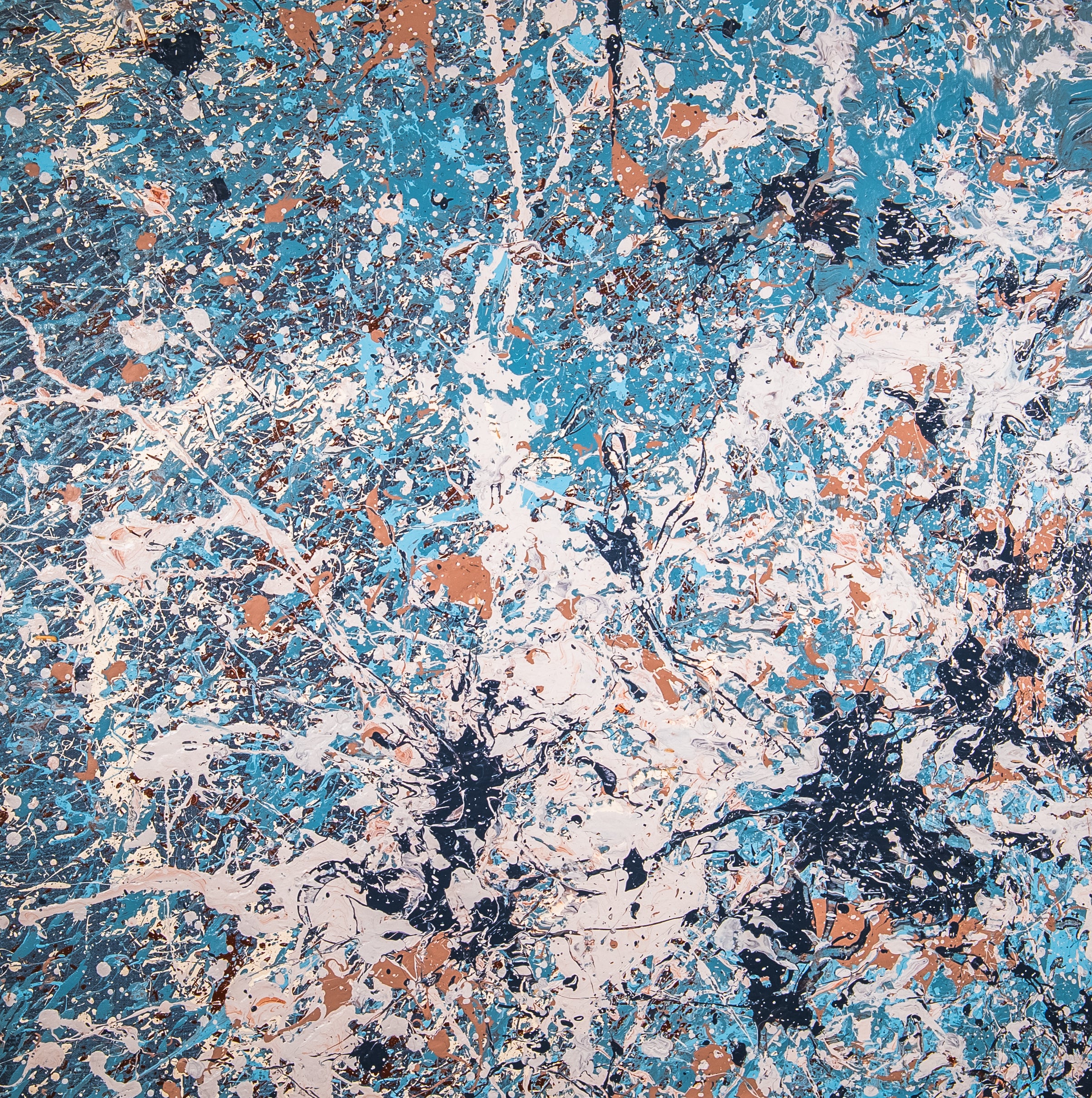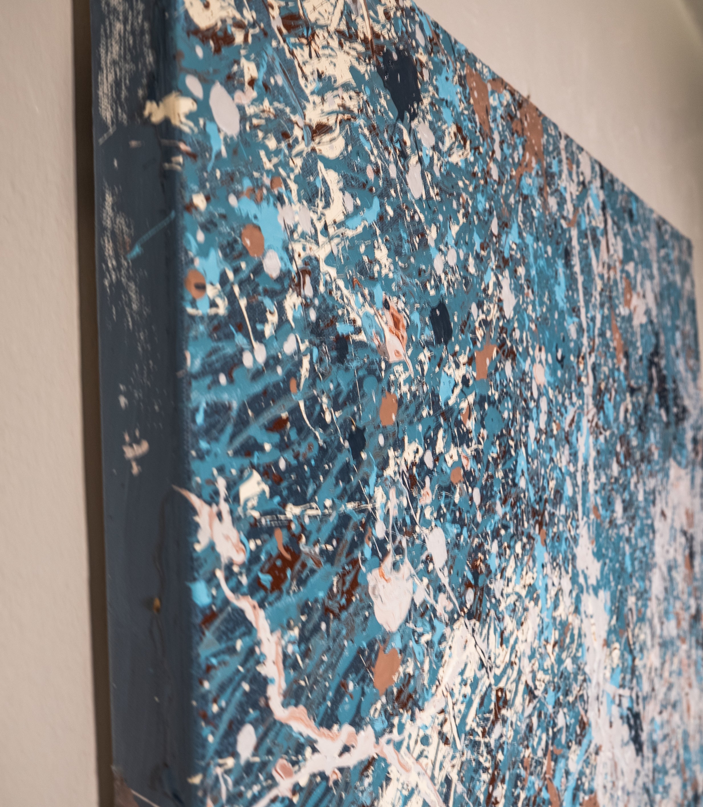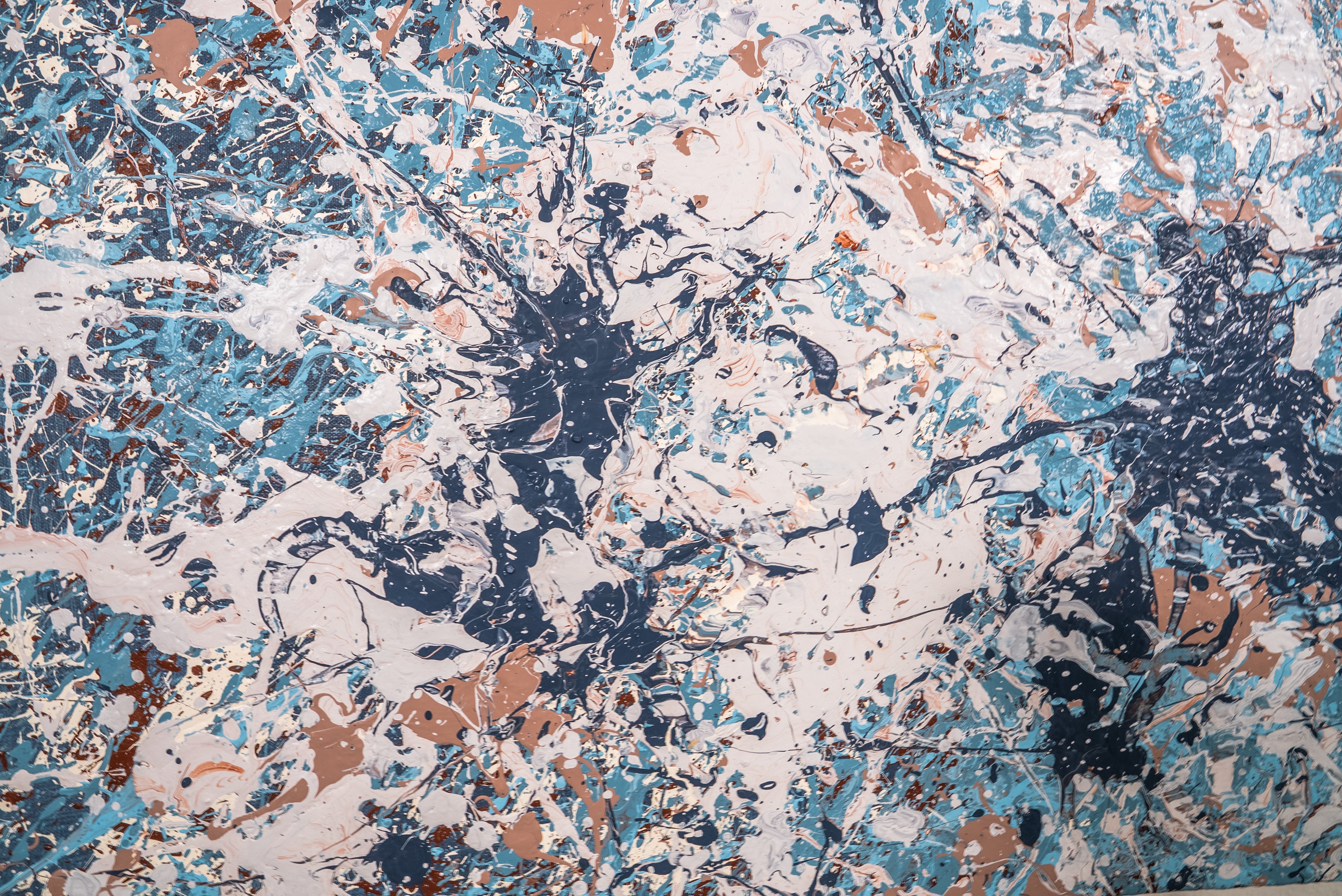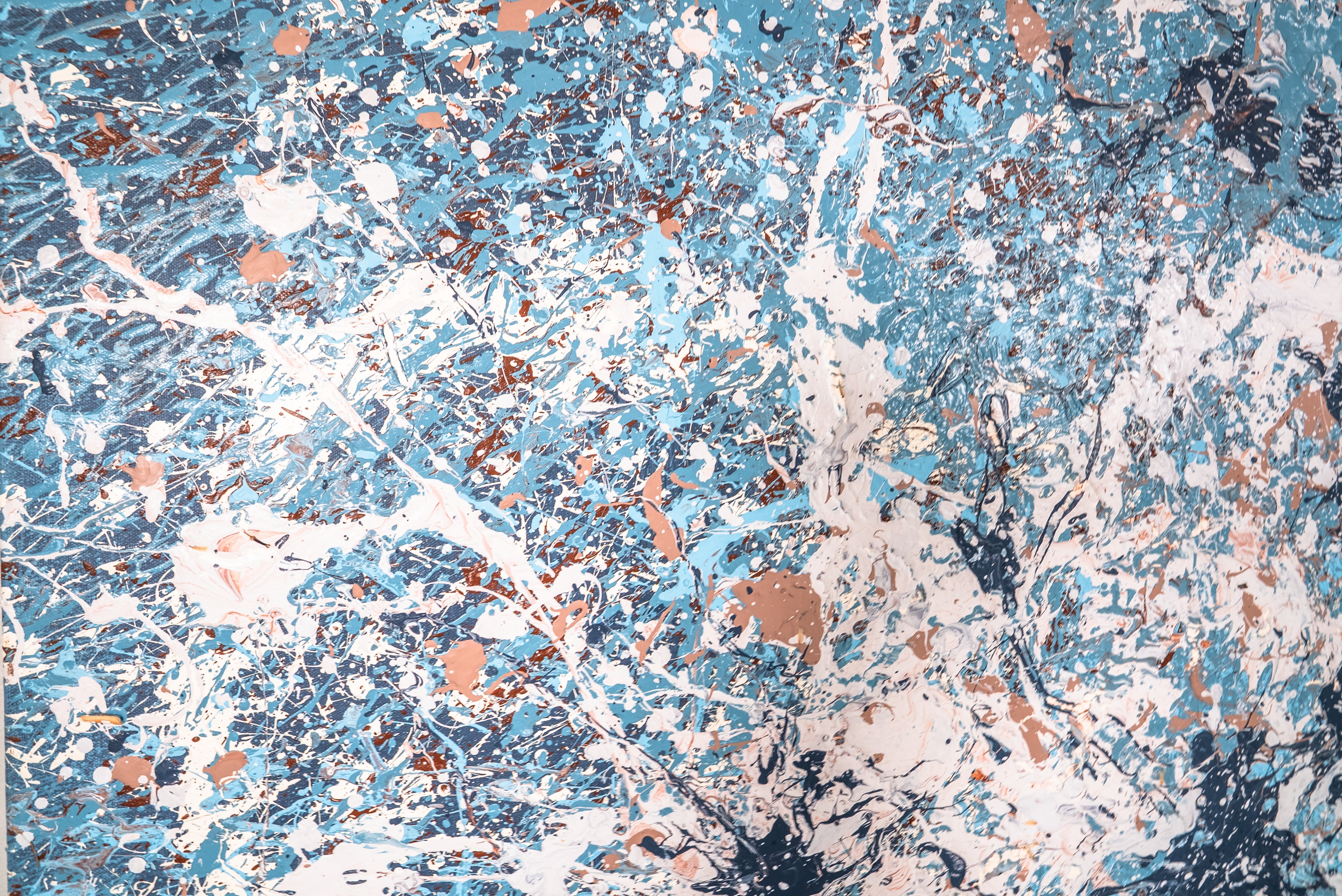 For this project, our team was suspended from a crane that lifted from 6-75ft off the ground. (9) 36" x 36" canvas were arranged below, and meticulously splattered from various Heights, creating elegant patterns of overlapping paint. This act was performed to see how we could push ourselves as artists - with the intent of spreading peace. This specific color palette is soothing, freeing, and inspires hope. These pieces look elegant on the wall in any home or business looking to bring their indoor environment to life. Upon the completion of these works, our crane operator compared these to the works of Diego Rivera & Picasso.
